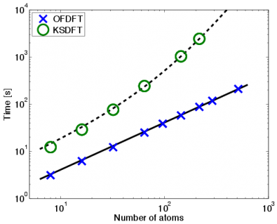 Linear scaling of orbital-free DFT compared to the superlinear scaling of Kohn-Sham DFT. See our paper, Ref. [3], for the details.